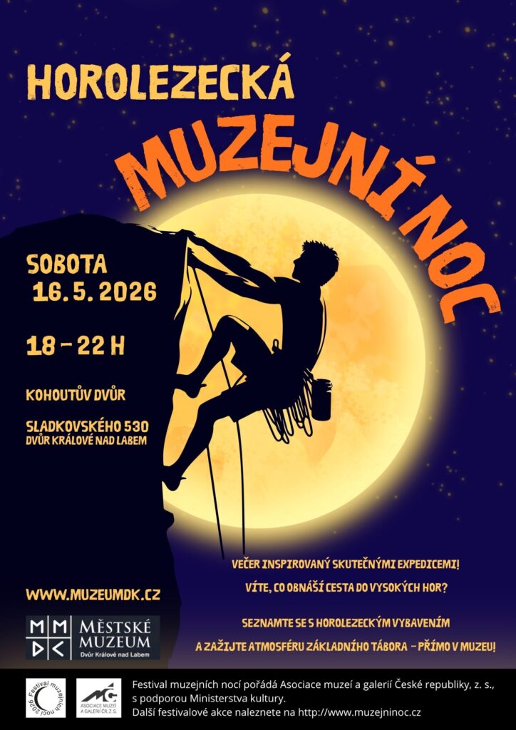 Městské muzeum ve Dvoře Králové nad Labem zve na Muzejní noc s tematikou horolezectví. Večerní program přiblíží svět vysokých hor prostřednictvím zážitků inspirovaných skutečnými expedicemi i praktických aktivit, které návštěvníkům umožní vyzkoušet si, co všechno taková cesta obnáší. Součástí večera bude také představení horolezeckého vybavení a atmosféra, která promění muzeum v pomyslný základní tábor. Program je připraven pro děti i dospělé a nabídne kombinaci pohybu, objevování i nevšedních zážitků. Přijďte strávit noc v muzeu trochu jinak – blíž horám, než byste čekali.