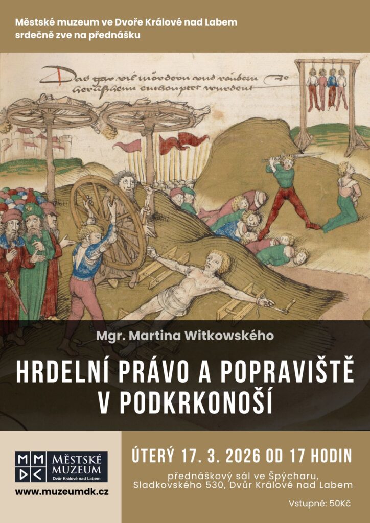 Přednáška Mgr. Martina Witkowského přiblíží historii hrdelního práva na území celého Podkrkonoší (s hlubším zaměřením na Trutnovsko). Vrátíme se zpět do časů zlodějů, šejdířů, ale i vrahů a také těch, kdo jejich činy trestali – tedy katů, rasů a pohodných. Povíme si, kde měla města v našem regionu svá popraviště, jak zdejší popraviště vypadaly, jak se postupem času vyvíjely, zda se zde uplatňovalo útrpné právo atd.