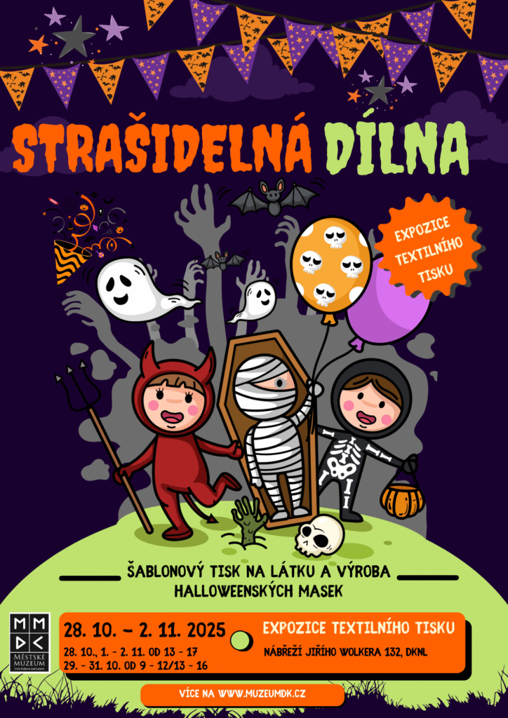Podzimní prázdniny budou u nás patřit Halloweenu – expozice textilního tisku se promění v kouzelné místo plné fantazie a tvoření. Děti i dospělí si mohou vyzkoušet tisk strašidelných motivů na látku a vyrobit si vlastní masku, se kterou se rázem promění v tajemnou bytost. Čeká vás zábava, barevná tvořivost a halloweenská atmosféra, která potěší malé i velké návštěvníky. Nemusíte se bát – vstup je pro všechny odvážlivce, kteří si chtějí odnést originální výrobek a podzimní zážitek navíc.