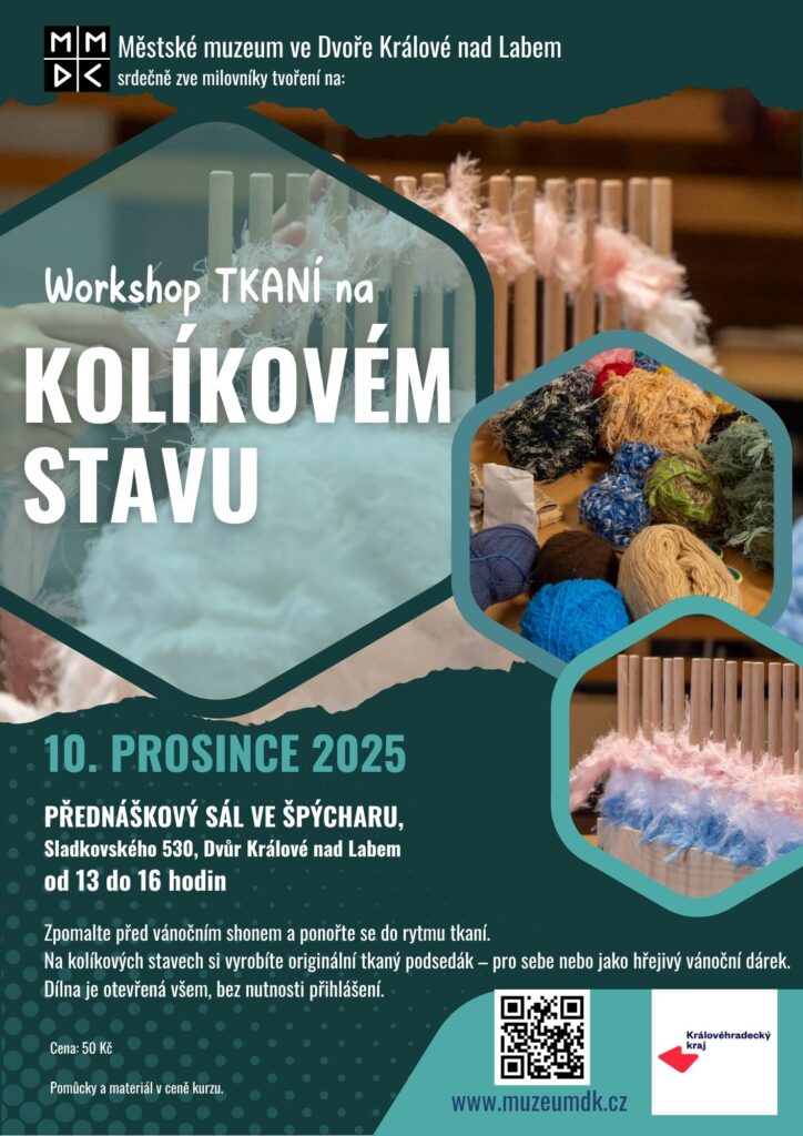 Zpomalte před vánočním shonem a ponořte se do rytmu tkaní. Na kolíkových stavech si vyrobíte originální tkaný podsedák – pro sebe nebo jako hřejivý vánoční dárek. Dílna je otevřená všem, bez nutnosti přihlášení.